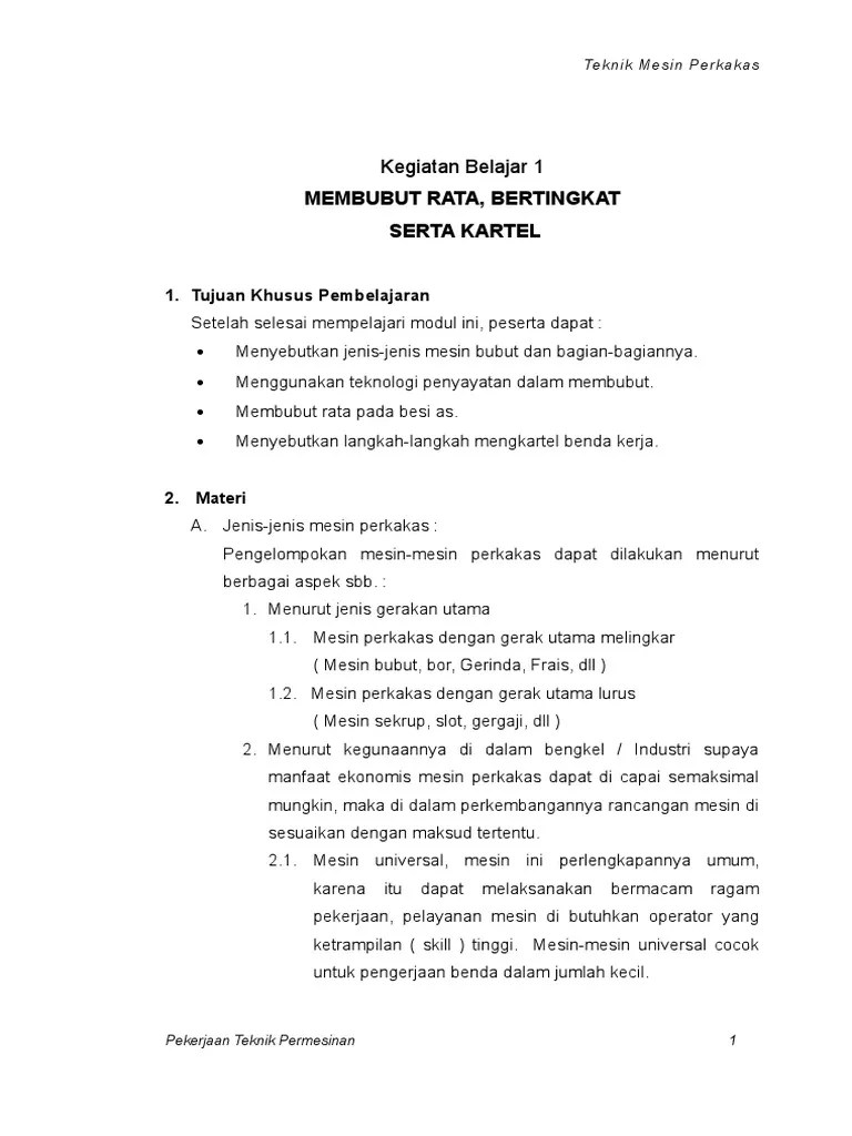 Pengertian mesin bubut mesin bubut (turning machine) adalah suatu jenis mesin perkakas yang dalam proses kerjanya bergerak memutar benda kerja dan menggunakan mata potong pahat (tools) sebagai alat untuk menyayat benda kerja tersebut. Download smk10 teknikpemesinan widarto pdf for free. Pembubutan drillng, yaitu pembubutan dengan menggunakan mata bor (drill), sehingga akan diperoleh lubang pada benda kerja. Gambar.4 gerak makan (f) dan kedalaman potong (a) beberapa proses pemesinan selain proses bubut pada gambar.1, pada mesin bubut dapat juga dilakukan proses pemesinan yang lain, yaitu bubut dalam (internal turning), proses pembuatan lubang dengan mata bor (drilling), proses memperbesar lubang (boring), pembuatan ulir (thread cutting), dan pembuatan alur (grooving/partingoff). Perluasan lubang (boring), yaitu proses pembubutan yang bertujuan untuk memperbesar lubang. Membubut benda kerja sesuai spesifikasi yang diinginkan. dalam rapat kerja tim, yang fasilitatornya tidak memiliki agenda yang dirahasiakan, maka orang akan cenderung jujur. Pada mesin uji yang baik, skala akan menunjukkan usaha lebih dari 0,05 kilogram meter (kg m), pada saat pendulum mencapai kedudukan 4. dengan cara ini, tangan manusia adalah alat, tetapi bukan mesin. akan tetapi jika pekerjaan shift iii dimulai pukul 23.00 maka pekerja akan berangkat dari rumah mereka sebelum pukul 23.00 waktu tersebut jika di bandingkan dengan pukul 00.00 akan lebih baik dari segi psikologis dan fisiologis, setidaknya perasaan ngantuk yang dirasakan pekerja jika pergi bekerja sebelum pukul 23.00 akan lebih kecil disbanding. Gerakan putar dari benda kerja disebut gerak potong relatif dan gerakkan translasi dari pahat disebut gerak umpan. Proses pemesinan dengan mesin frais merupakan proses penyayatan benda kerja yang sangat efektif, karena pisau frais memiliki sisi potong jamak. Gunakan selalu alat dan perlengkapan yang ditentukan.